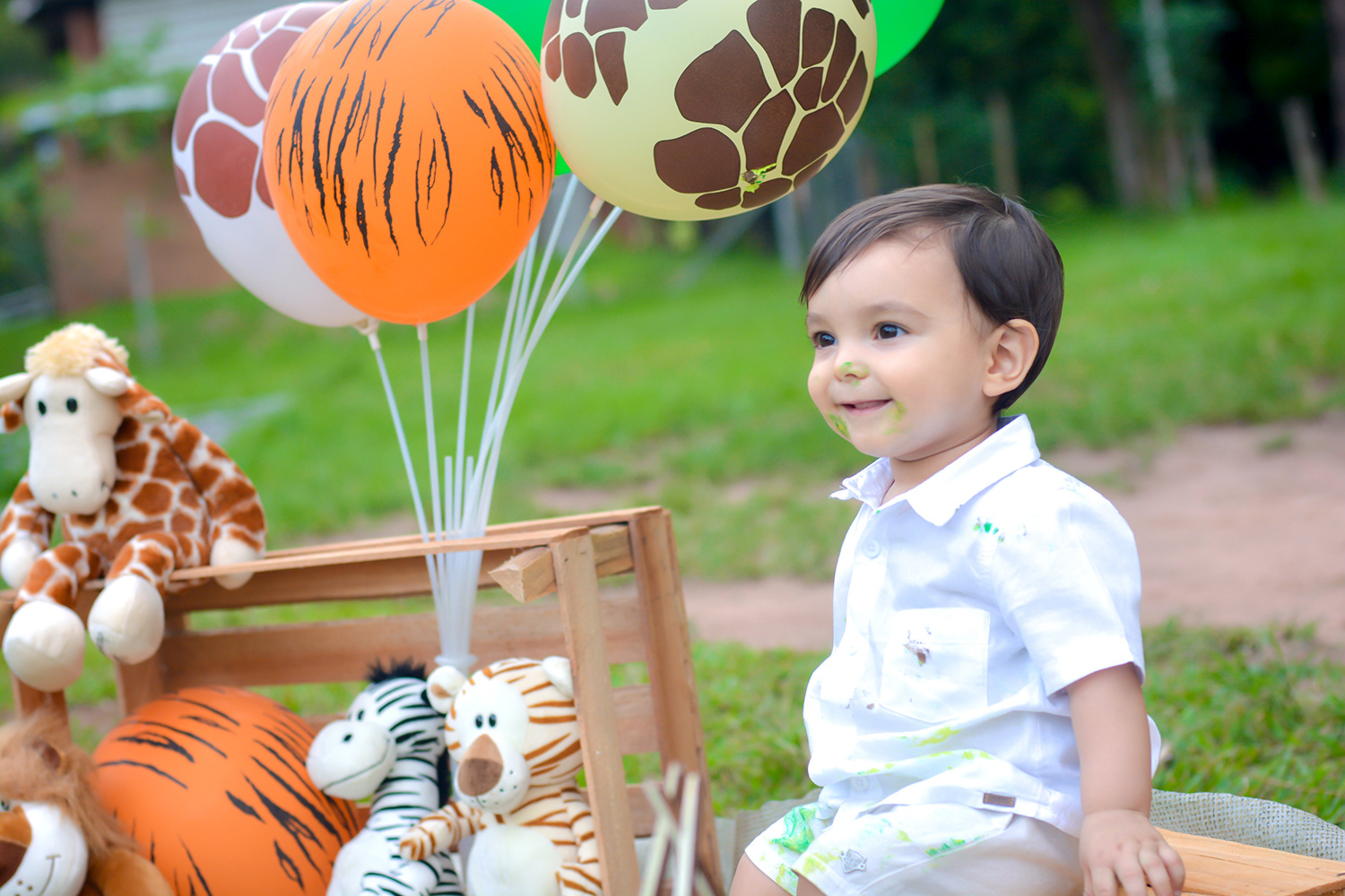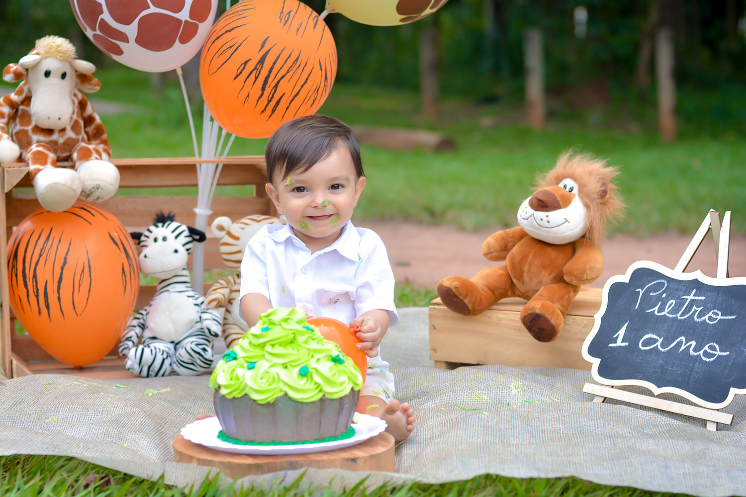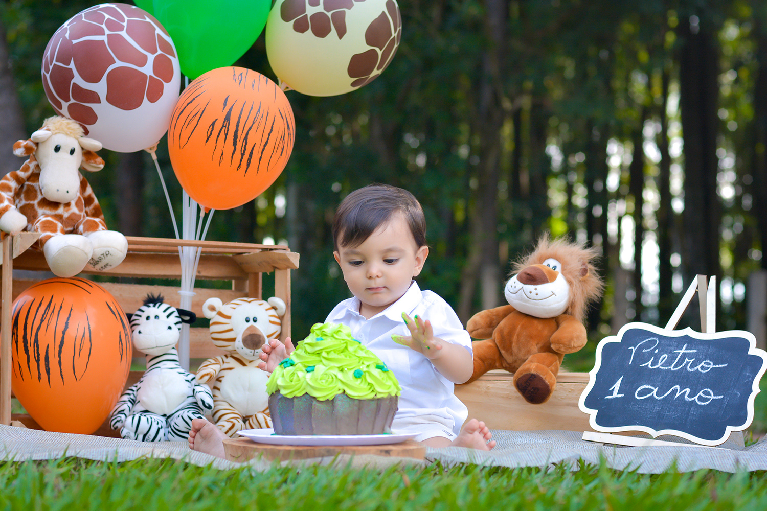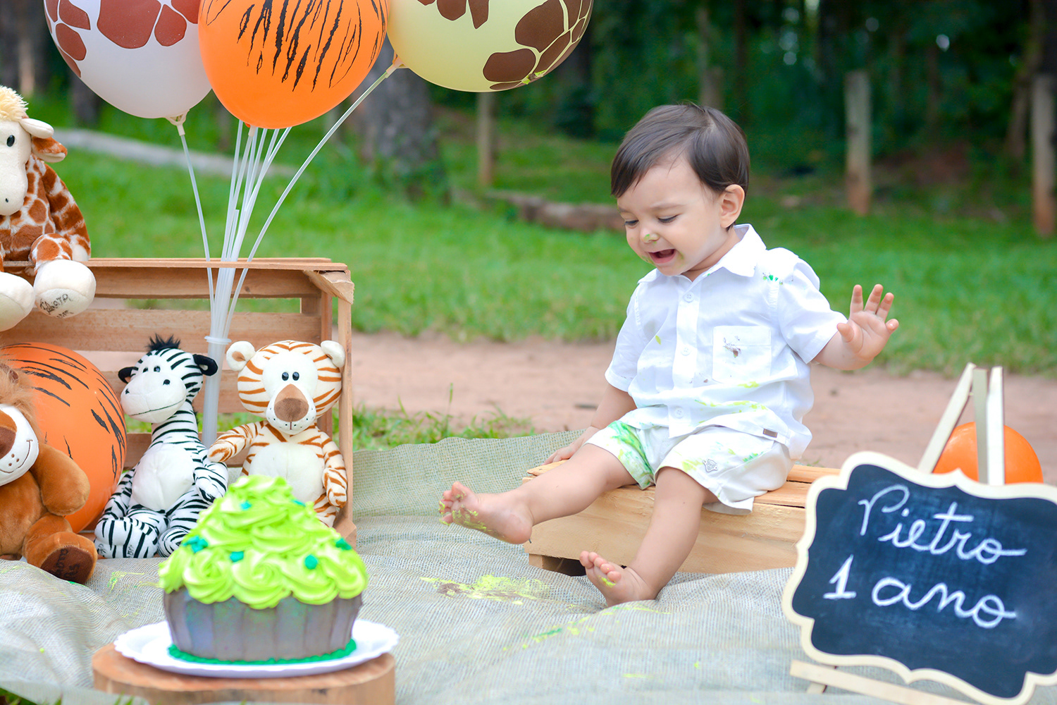 Pietro chegou todo animado na sessão, mas o bolo ele não gostou muito hahahahahhahaha mas ficou lindo nas fotos que foram feitas no Horto Florestal de Limeira/SP, o bolo todo personalizado com o tema safari, combinou super com o cenário e com a festa do seu primeiro aninho.